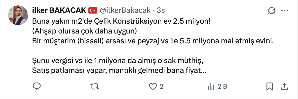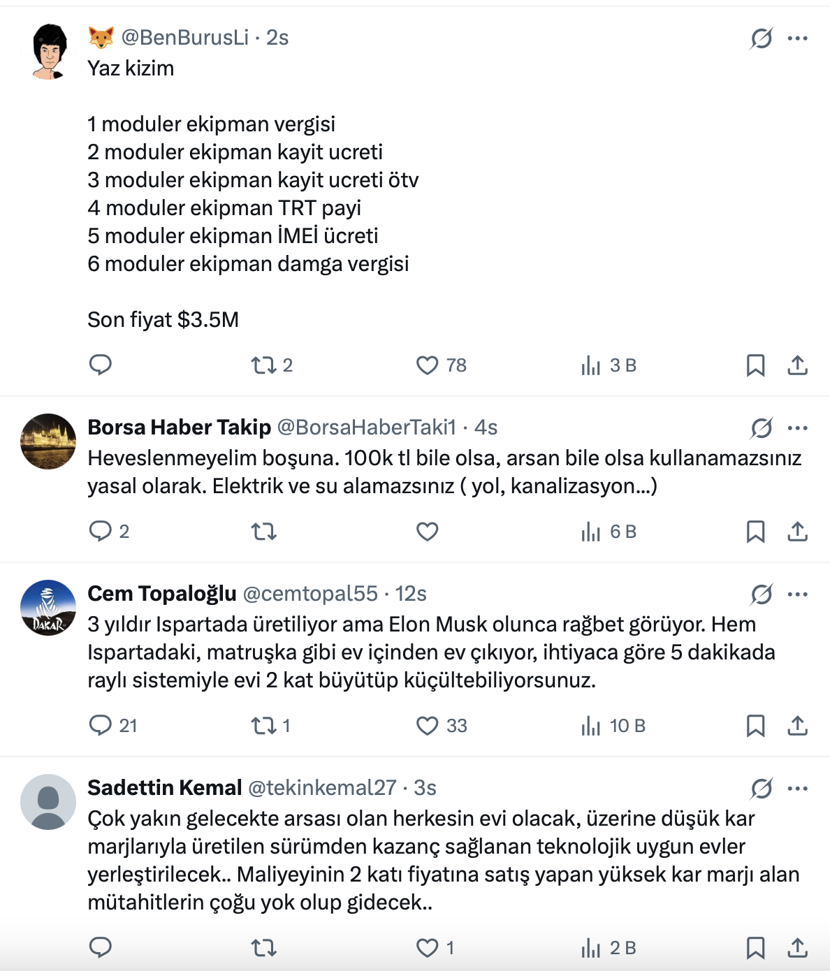 Elon Musk’ın modüler ev projesi pek çok kişinin gündeminde yer alırken, emlak, inşaat ve konut sektörü ile ilgili yaptığı paylaşımlarla dikkat çeken 66,8 bin takipçili İnşaat Doktoru resmi X hesabı https://twitter.com/insaatdr üzerinden konu ile ilgili bir paylaşım yaptı.