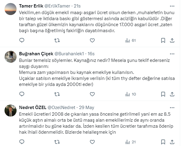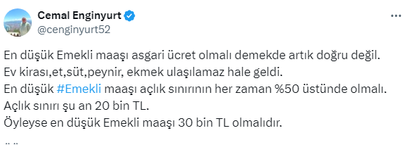 Hükümet tarafından emekliye zam oranıyla ilgili henüz net bir açıklama yapılmazken, Demokrat Parti Genel Başkan Yardımcısı ve İstanbul Milletvekili Cemal Enginyurt, en düşük emekli maaşıyla ilgili yeni bir rakam telaffuz etti. Enginyurt, https://x.com/cenginyurt52 X sosyal medya hesabı üzerinden yaptığı paylaşımda, en düşük emekli maaşının açlık sınırının yüzde 50 üzerinde olması gerektiğini belirtti. Emeklilere en az 30 bin TL verilmesi gerektiğini söyledi. Emekliler Enginyurt’un paylaşımına yorum yağdırdı.