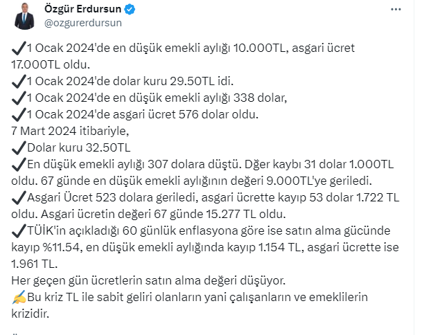 Erdursun yaptığı paylaşımda 1 Ocak 2024’ten bu yana emekli ve asgari ücretlinin kaybını hesapladı. Bakın emekli ve asgari ücretlinin maaşı ne kadar eridi? İşte Erdursun’un hesabı…