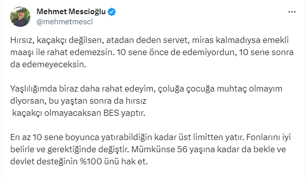 Bundan 10 yıl önce de 10 yıl sonra da emekli maaşıyla rahat bir hayat sürdürülemeyeceğini söyleyen Mescomedia Genel Müdürü ve borsacı Mehmet Mescioğlu, twitter.com/mehmetmesci X sosyal medya hesabından yaptığı paylaşımda, “Yaşlılığımda biraz daha rahat edeyim diyor, hırsız kaçakçı olmayacaksan BES yaptır” dedi ve nedenlerini açıkladı. BES'te daha çok kazanmak için yapılması gerekenleri tek tek anlattı.