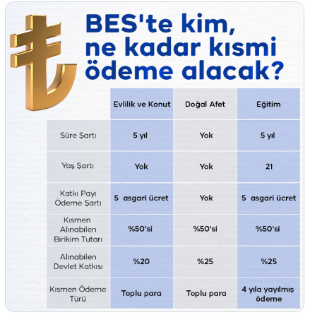 Şartları sağlamadan acil para lazım olursa, kontratını bozmadan kısmı ödeme de kullanabiliyoruz artık. Evlilik, konut sahibi olma, doğal afet veya eğitim gibi bir gerekçe ile aşağıdaki şekilde.