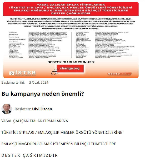 Konuyla ilgili görüşünü aldığımız kampanyayı başlatanlardan İstanbul Emlak Brokerleri Kulübü İşletme Kooperatifi Başkanı Ulvi Özcan kampanyayı başlatmaktan amaç ve bekledikleri faydayı şu kelimelerle ifade etti : ‘’Sektöre çekidüzen getirmemesi beklenen Taşınmaz Ticareti Hakkındaki Yönetmelik’te ilan portalları ile ilgili 31.08.2023’de bir revizyon yapıldı ve yapılan düzenlemelerle ilanlara çeki düzen verildiği iddia edildi. Uygulama 1 Kasım 2023’de yürürlüğe girdi ve iddia edilen faydayı maalesef göremedik.