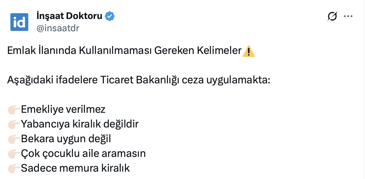 Emlak sektöründeki fahiş fiyatlar son günlerin en çok konuşulan konuları arasında yer alırken, 64,4 bin bin takipçili İnşaat Doktoru resmi X hesabı https://twitter.com/insaatdr üzerinden emlak ilanında kullanılmaması gereken kelimeleri açıkladı.