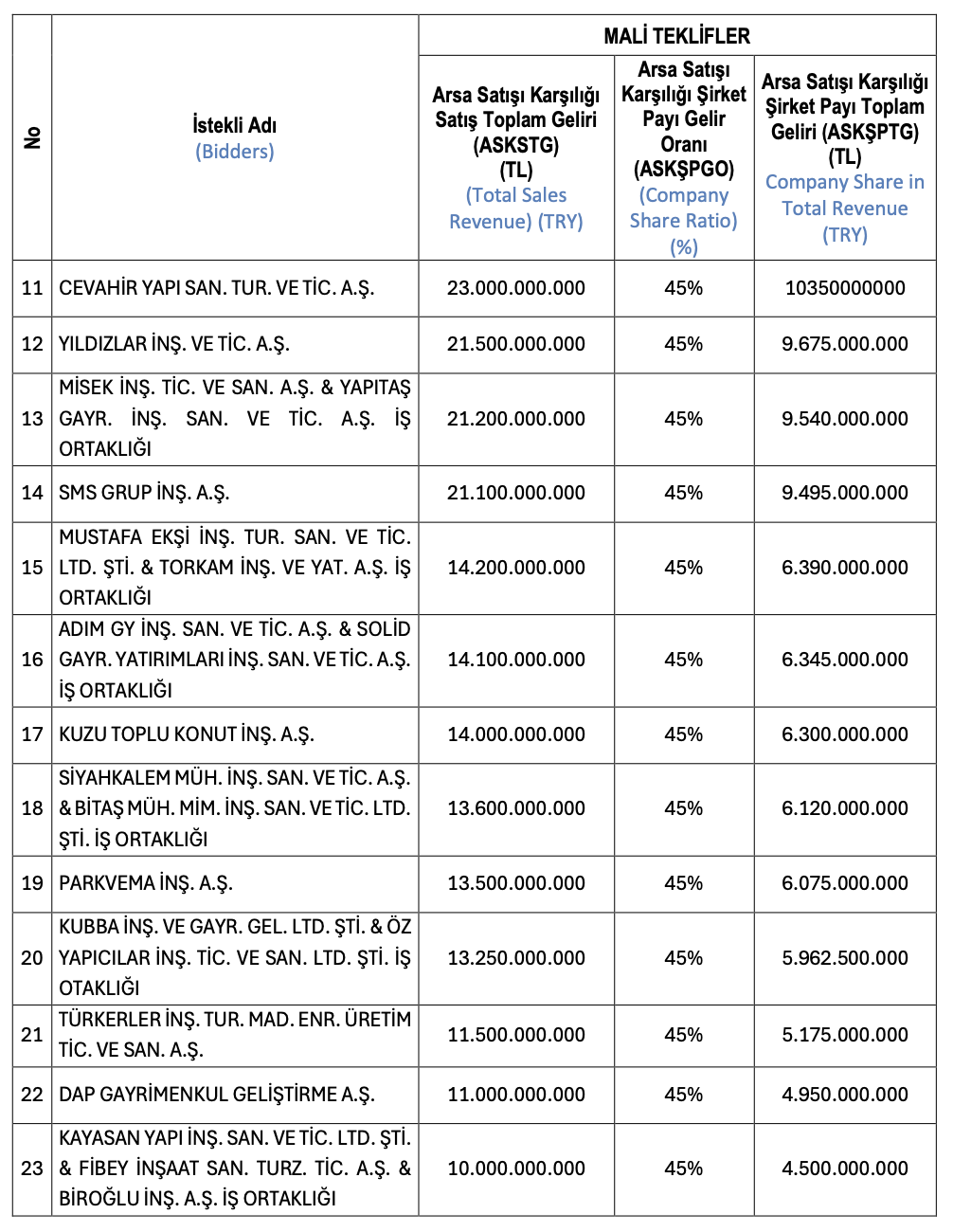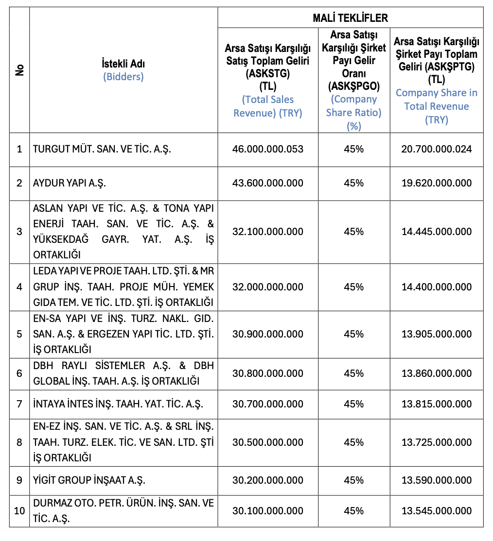İhale neticesinde ulaşılan 20.7 milyar TL seviyesindeki toplam Şirket Payı Geliri, söz konusu arsanın 3.8 milyar TL ekspertiz değerinin 5,44 katına tekabül ediyor.