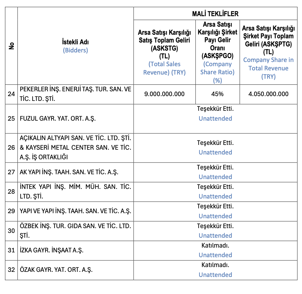 İhale neticesinde ulaşılan 20.7 milyar TL seviyesindeki toplam Şirket Payı Geliri, söz konusu arsanın 3.8 milyar TL ekspertiz değerinin 5,44 katına tekabül etmektedir.