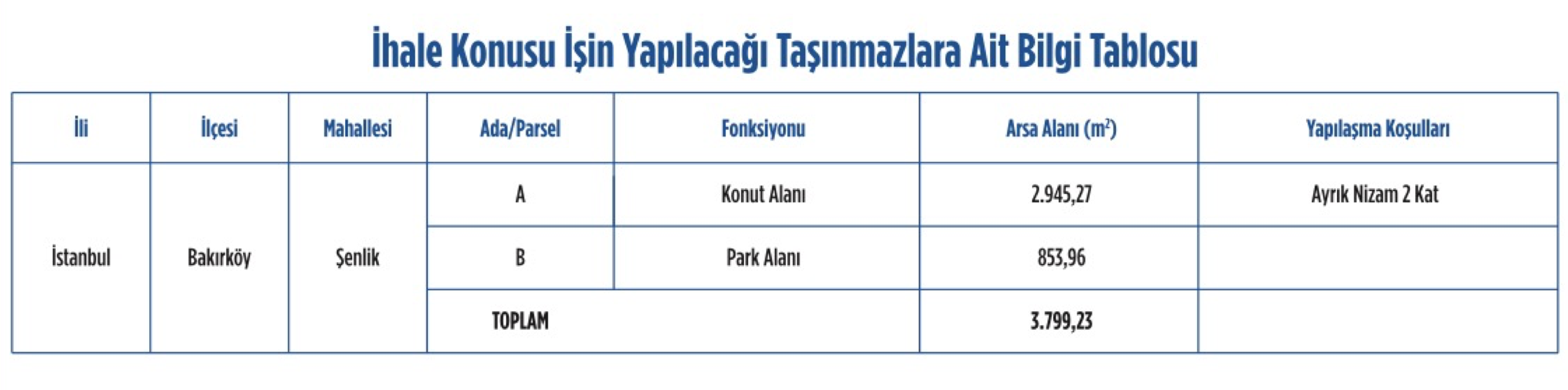 Emlak Konut GYO’nun Bakırköy Şenlik arsasının fonksiyonu konut alanı ve park alanı şeklinde belirtildi. Konut alanı 2 bin 945,27 metrekare, park alanı 853,96 metrekare olan arsanın toplam alanı 3 bin 799,23 metrekare.
