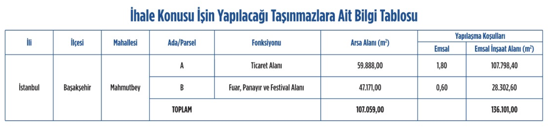 Toplam 107 bin 59 metrekare olan arsanın 59 bin 888 metrekarelik kısmı ticaret alanı fonksiyonlu, 47 bin 171 metrekarelik kısmı ise fuar, panayır ve festival alanı fonksiyonlu. Arsanın emsal inşaat alanı 136 bin 101 metrekare olarak belirtild.