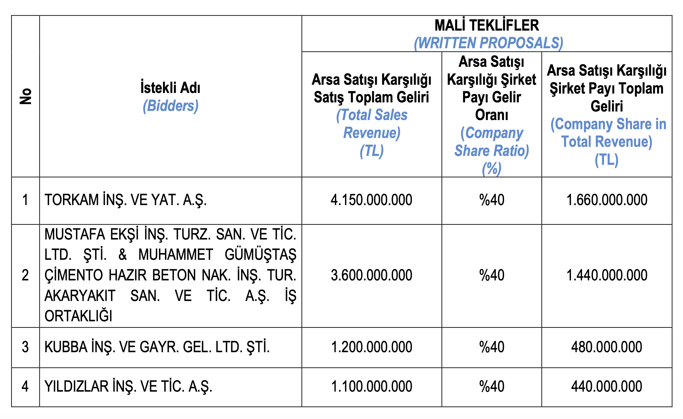 Emlak Konut GYO Muğla Bodrum Ortakent 1. Etap Arsa Satışı Karşılığı Gelir Paylaşımı İşi ihalesinin 2. oturumuna teklif veren firmalar şu şekildeydi: