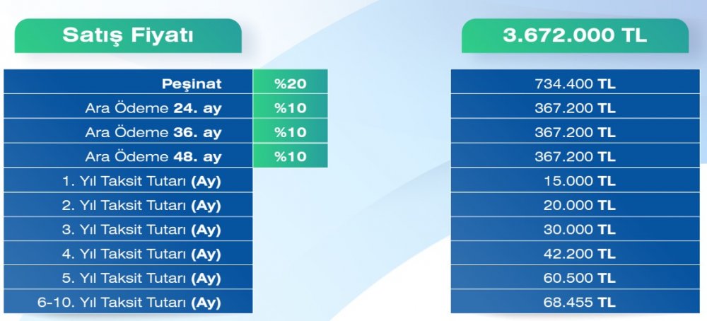 3+1 konutlar için ödeme planı