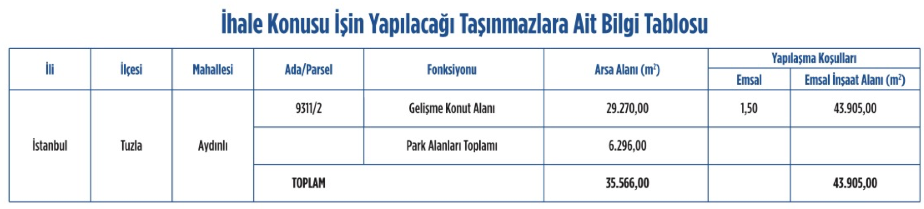 Emsalin 1,50 şeklinde belirtildiği Emlak Konut GYO Tuzla arsasının emsal inşaat alanı 43 bin 905 metrekare olarak belirtildi.