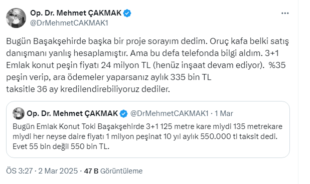 Bir tepki de Op. Dr. Mehmet Çakmak'tan geldi. Çakmak, Başakşehir'deki bir projenin, peşin fiyatı 24 milyon TL (henüz inşaat devam ediyor). % 35 peşin verip, ara ödemeler yapılması halinde ylık 335 bin TL taksitle 36 ay kredilendiriliyor bu durumda ise evin aylık taksit ödemesi 550 bin TL olduğunu söyleyerek şaşkınlığını dile getirdi.