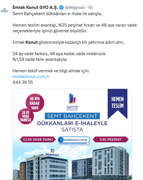 Emlak Konut GYO sosyal medya hesabından Semt Bahçekent projesindeki dükkanların e-ihaleyle satışa çıktığını duyurdu. Toplam 12 dükkanın satıldığı ihaledeki dükkanların büyüklüğü 18 metrekareden başlayıp 221 metrekareye kadar yükseliyor.
