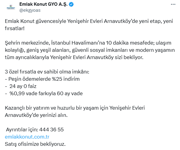 Emlak Konut GYO, Yenişehir Evleri ile ilgili sosyal medya hesabından açıklama yaptı. 3 özel fırsatla ev sahibi olma imkânı sunan şirket, ödeme koşullarını açıkladı. Bu kampanyalar peşin ödemelerde yüzde 25 indirim, 24 ay 0 faiz ve yüzde 0,99 vade farkıyla 60 ay vade imkanı sunuluyor.