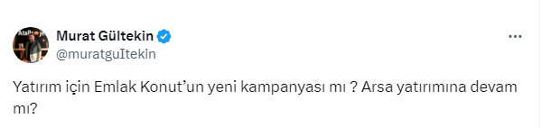 Gayrimenkul ve Yatırım Uzmanı Murat Gültekin https://x.com/muratguItekin X sosyal medya hesabından yaptığı paylaşımda, “Yatırım için Emlak Konut’un yeni kampanyası mı? Arsa yatırımına devam mı?” diye sordu.