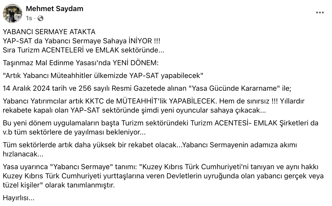 Söz konusu bu düzenlemeyle, KKTC'de "Yap-Sat" sektörüne yabancı yatırımcıların katılımı sınırsız olurken, söz konusu sektörde senelerdir devam eden rekabet eksikliğinin sona ermesi bekleniyor. Ekonomist Mehmet Saydam, sosyal medya hesabı üzerinden yaptığı paylaşımda bu gelişmeyi “Yabancı Sermaye Atağı” şeklinde değerlendirerek, yapılan bu düzenlemenin turizm acenteleri ve emlak şirketleri başta olmak üzere diğer sektörlere de yayılacağını söyledi.