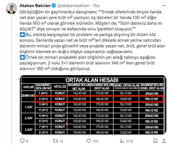 Bakılan, emlak sitelerindeki farklı metrekare büyüklüklerine dikkat çekti ve asıl metrekarenin dairenin proje görselinden öğrenilebileceğini söyledi. İşte Atakan Bakılan'ın sosyal medya hesabı X'ten yaptığı o paylaşım...