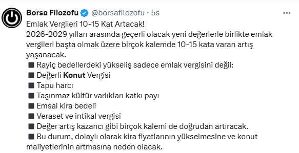 2026-2029 yılları arasında geçerli olacak yeni düzenleme ile emlak vergileri başta olmak üzere birçok kalemde 10-15 kata varan artış yaşanacak. Peki bu artış konut piyasasını nasıl etkileyecek? Borss Filozofu sosyal medya hesabı X'ten açıkladı. İşte ayrıntılar...