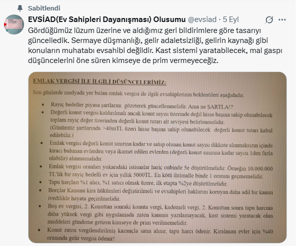 Mağdur ev sahiplerini temsil eden EVSİAD (Ev Sahipleri Dayanışması), son zamanlarda gündeme gelen emlak vergilerindeki fahiş artışlarla ilgili ev sahiplerinin beklentilerini açıkladı.