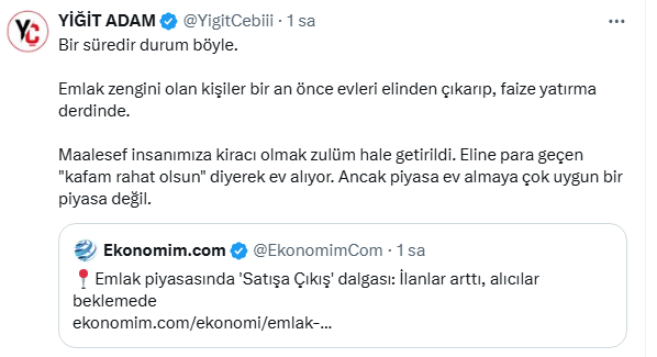 Sosyal medya X'ten yaptığı piyasa analizleri ile dikkatleri üzerine çeken dair Yiğit Cebii, emlak zengilerinin evlerini ellerinden çıkararak mevduata yatırdıklarını söyledi.