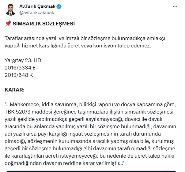 Çakmak Yargıtay'ın konuyla ilgili kararını açıklayarak vatandaşları emlakçı komisyonu konusunda uyarıyor: ''Taraflar arasında yazılı ve imzalı bir sözleşme bulunmadıkça emlakçı yaptığı hizmet karşılığında ücret veya komisyon talep edemez''