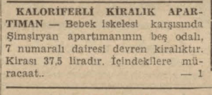 İstanbul'da lira fiyatları günümüzde 10 bin TL'den başlıyor. Akşam gazetesinin 1942 yılındaki satılık ve kiralık konut ilanlarında Bebek İskelesi karşısındaki Şimsiryan Apartmanındaki daire 37,5 liraya kiralanmış. İlanda kiralık dairenin 5 odalı ve kaloriferli olduğu belirtilmiş.