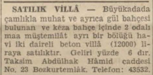1941 yılı Akşam Gazetesi'ndeki ilanda Büyükada'da bir villanın 12 bin liraya satılacağı yazıyor. Villanın bahçe içinde 2 adet odalı müştemilat ve gül bahçesi bulunuyormuş.