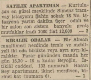 KİRALIK ODALAR Bir Alman muallimesi nezdinde temiz ve mobilyeli iki oda birlikte veya ayrı ayrı kiralıktır. Pazar gününden maada her gün 15,30 19 a kadar Beyoğlu, İstiklal caddesi, 133 numaralı Hasan Bey apartımanı, ikinci merpen, birinci kat (numara 6).