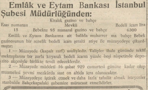Emlak ve Eytam Bankasına ait balada muharrer ma bahçe Bebek Gazinosu'nun bir senelik bedeli icarı şeraiti atiye ile müzayedeye çıkarılmıştır: 1-Müzayede (kapalı zarf) usulüyledir. Talipler ihale gününde teklif mektuplarını bir zarfa koyarak bedeli icarm yüzde beşi nispetinde depo- zito akçesiyle birlikte tevdi edeceklerdir.
