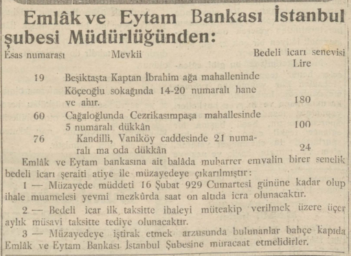 Emlak ve Eytam Bankası, 1929 yılında Cumhuriyet Gazetesi'ne verdiği ilanda; Beşiktaş Kaplan İbrahim Mahallesi'ndaki ev ve ahırı 180 liraya, Cağaoğlu'ndaki dükkanı 100 liraya, Kandilli Vaniköy Caddesi'ndeki dükkanı ise 24 liraya 1 seneliğine kiraya çıkardığını duyurmuş...