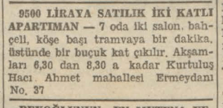 İstanbul'un göbeğinde 2 katlı apartman 1942 yılında 9 bin 500 liraya satışa çıkarılmış. İlan, Akşam Gazetesi'nin 1942 Temmuz ayındaki gazete haberinde yer alıyor.