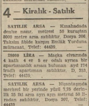 1942 yılında İstanbul Kınalıada'da deniz manzaralı 8000 metrekare arsa satışa çıkarılmış. Arsayı satanlar arsanın metrekaresi için 50 kuruş istemiş...
