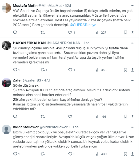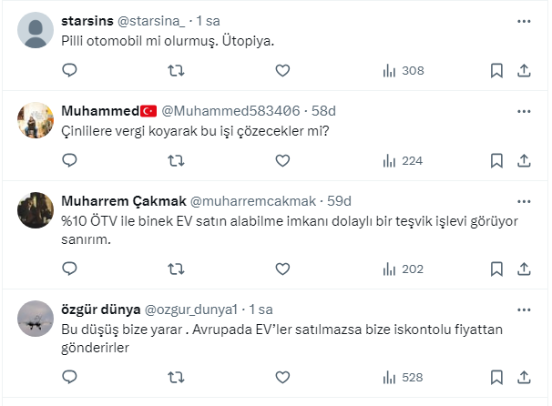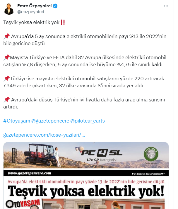 Mayıs ayında Türkiye ve EFTA dahil 32 Avrupa ülkesinde elektrikli otomobil satışları yüzde 7,8 düşerken, 5 ay sonunda ise büyüme yüzde 4,75 ile sınırlı kaldı. Bazı ülkelerde teşviklerin bitmesi bunda etkili olurken, ilk 5 ayda Avrupa’da elektrikli otomobillerin payı yüzde 13 ile 2022’nin bile gerisinde kaldı. Türkiye’de ise ÖTV teşvikinin etkisiyle payı hızla artıyor. Gazeteci Emre Özpeynirci sosyal medya hesabı X'ten elektrikli otombil piyasasını değerlendirerek ''Teşvik yoksa elektrik yok!'' ifadesini kullandı. İşte o paylaşım ve gelen yorumlar...