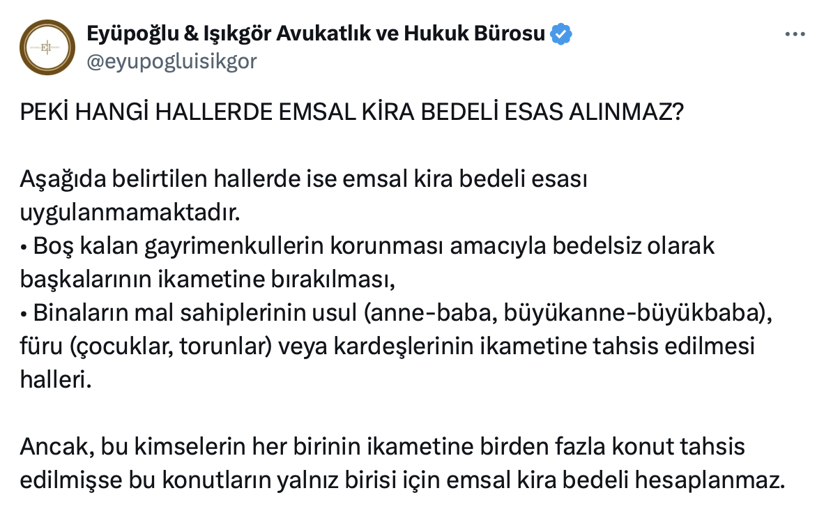 Eyüpoğlu - Işıkgör Avukatlık ve Hukuk Bürosu resmi sosyal medya hesabı https://x.com/eyupogluisikgor üzerinden yaptığı paylaşımda hangi hallerde emsal kira bedelinin esas alınmayacağını açıkladı.