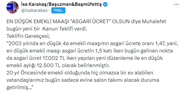 EN DÜŞÜK EMEKLİ MAAŞI "ASGARİ ÜCRET" OLSUN diye Muhalefet bugün yeni bir Kanun Teklifi verdi. Teklifin Gerekçesi; "2003 yılında en düşük 4a emekli maaşının asgari ücrete oranı 1,47, yani, en düşük emekli maaşı asgari ücretin 1,5 katı iken bugün gelinen nokta da asgari ücret 17.002 TL iken yapılan yeni düzenleme ile en düşük emekli aylığı 12.500 TL olarak belirlenmiştir. 20 yıl Öncesinde emekli olduğunda hiç olmazsa bir ev alabilen vatandaşlarımız bugün sadece evine salon takımı alacak duruma getirilmiş.