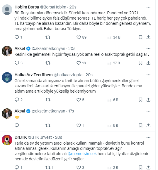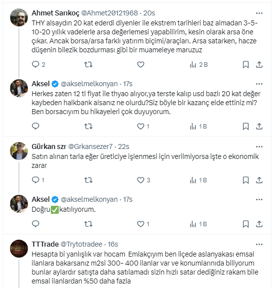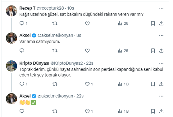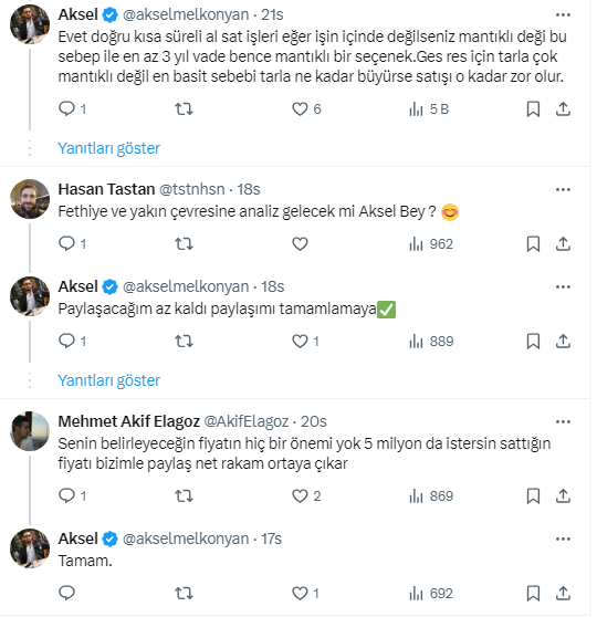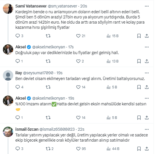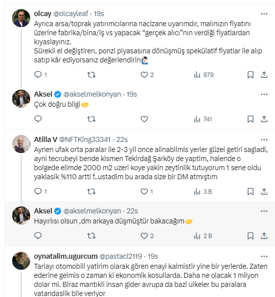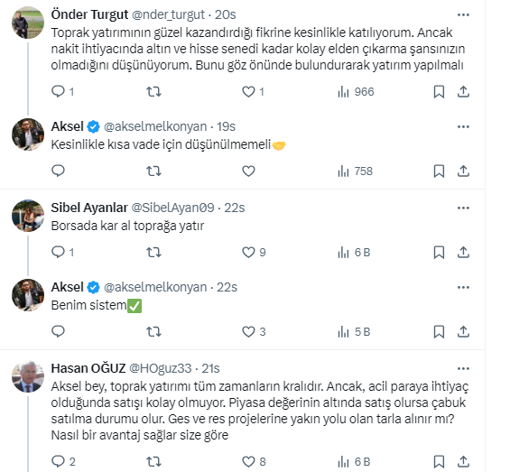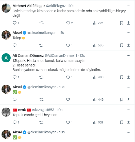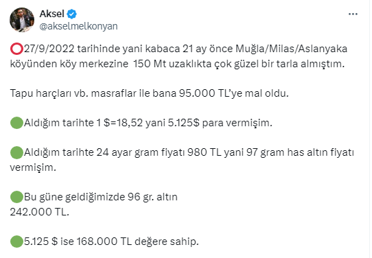 Toprak yatırımcısı ve danışmanı Aksel Melkonyan, https://x.com/akselmelkonyan X sosyal medya hesabından yaptığı paylaşımda 2 yıl önce yaptığı toprak yatırımını örnek göstererek, kazancını altın ve dolarla kıyasladı. Takipçilerine yatırım konusundaki görüşlerini sordu.