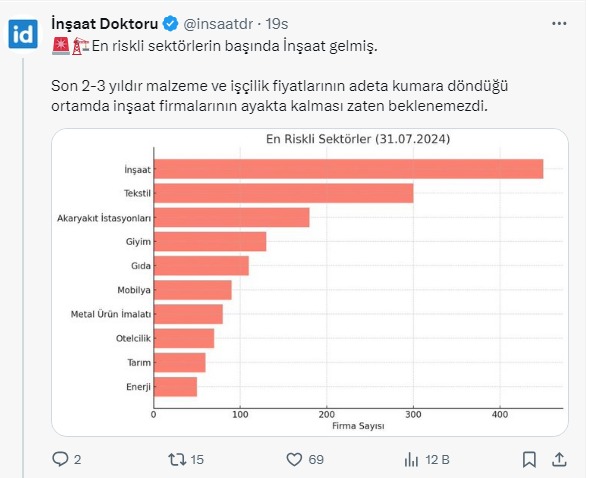 Hızla artan maliyetler ve satışların düşmesi inşaat sektöründeki krizi büyütüyor. Yılın ilk 7 ayında yapılan konkordato başvurularında inşaat sektörü başı çekti. Sosyal medyada 18 bin takipçili İnşaat Doktoru, son 2-3 yıldır malzeme ve işçilik fiyatlarının adeta kumara döndüğüne dikkat çekti.