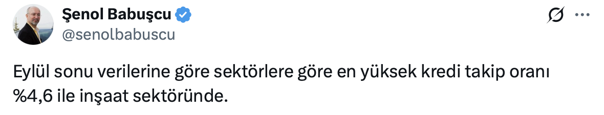 Şenol Babuşcu yaptığı paylaşımda en yüksek kredi takip oranının yüzde 4,6 ile inşaat sektöründe olduğunu söyledi.