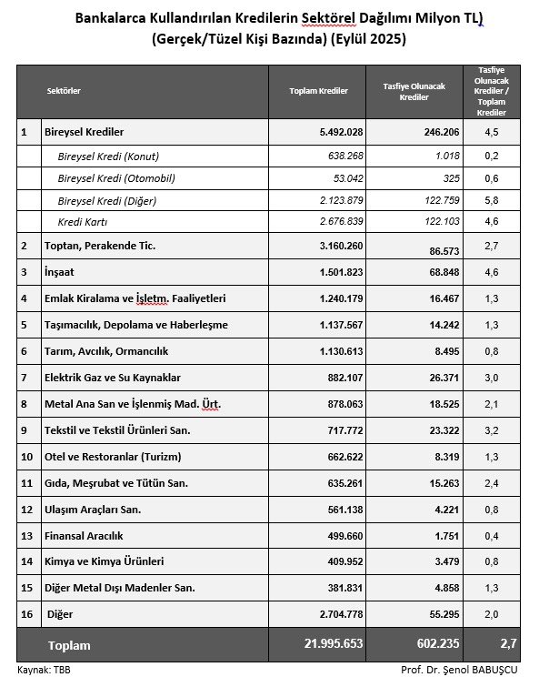 Başkent Üniversitesi Uluslararası Finans ve Bankacılık Bölüm Başkanı Prof. Dr. Şenol Babuşcu sosyal medya hesabı üzerinden yaptığı paylaşımda en yüksek kredi takip oranının yüzde 4,6 ile inşaat sektöründe olduğunu söyledi.