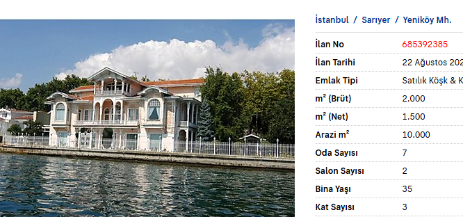 İlanın detayında yalıda sahibinin oturduğu bilgisi verildi. Kat mülkiyeti olan yalının toplam 7 oda, 2 salonu var. 35 yaşındaki yalı net 1500 metrekare ve 3 kattan oluşuyor.