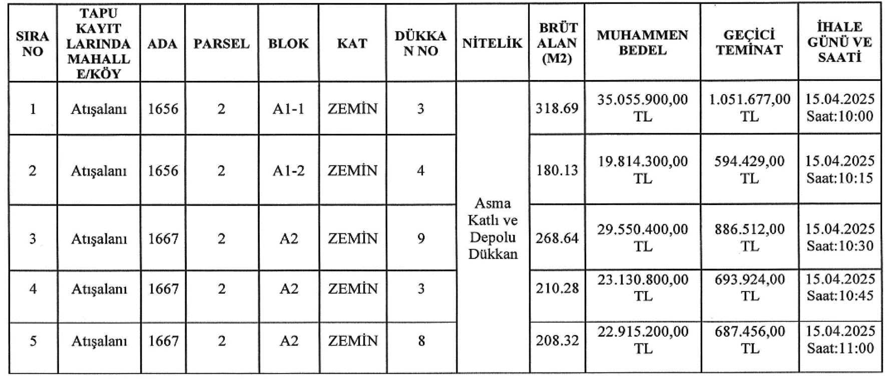 yapıların dönüşümünde afet riski alanların tahliyesinde, tasfiyesinde, inşasında, rezerv ve riskli alanlarda yapılacak olan Belediye Hizmet Binaları, Eğitim Yapıları, Dini Tesis Alanları, Kültür Tesisleri, Sosyal Donatı, Engelsiz Yaşam Alanları, Spor Salonları vb. yapıların inşasında, Riskli Alan, Rezerv Alan ve Riskli yapıların bulunduğu alanlarda kamulaştırma işlemlerinde kullanılmak amacıyla aşağıda tapu bilgileri ve niteliği belirtilen Esenler Belediyesi’ne ait 5 adet Asma Katlı ve Depolu Dükkân, İhale Komisyonu (Belediye Encümeni) tarafından 15/04/2025 günü 2886 sayılı Devlet İhale Kanunu’nun 35/a maddesi gereğince yapılacak ihaleyle satılacaktır.