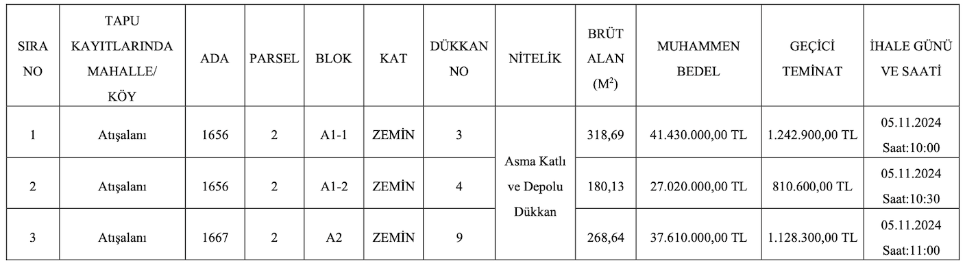 En düşük muhammen bedelin 27 milyon 20 bin TL, en yüksek muhammen bedelin ise 41 milyon 430 bin TL olarak açıklandığı dükkanlar için ödenecek geçici teminat bedelleri 810 bin 600 TL ile 1 milyon 242 bin 900 TL arasında farklılık gösteriyor.