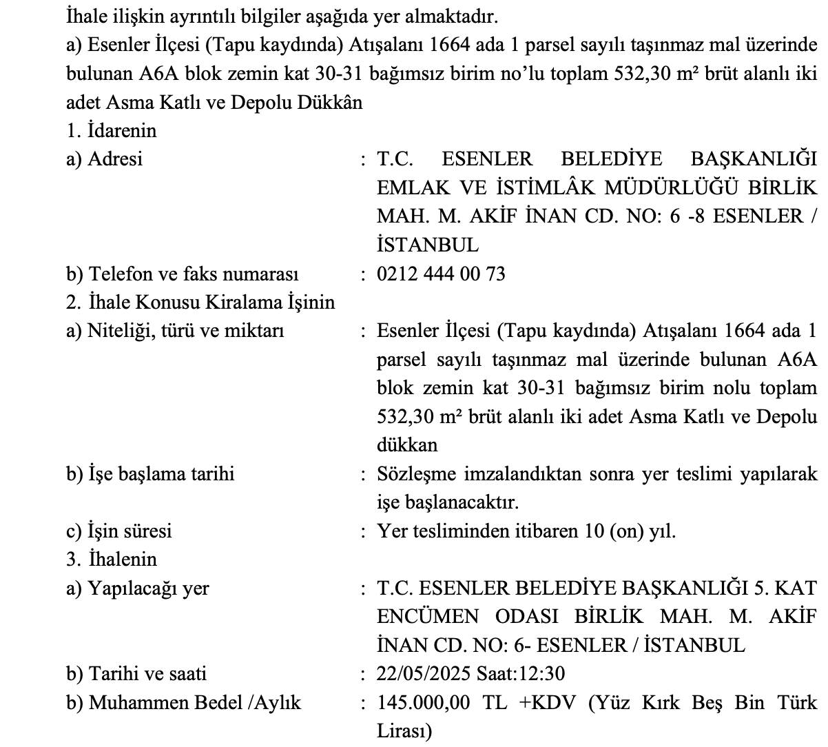 İş yerinin kiralama ihalesi 22 Mayıs 2025 tarihinde saat 12.30’da Esenler Belediye Başkanlığı 5. Kat Encümen Odası’nda yapılacak.