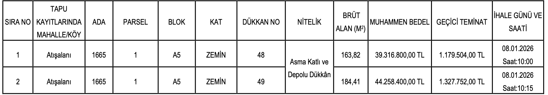 Muhammen bedelleri 39 milyon 316 bin 800 TL ve 44 milyon 258 bin 400 TL olarak açıklanan dükkanların geçici teminat bedelleri ise 1 milyon 179 bin 504 TL ve 1 milyon 327 bin 752 TL olarak açıklandı.
