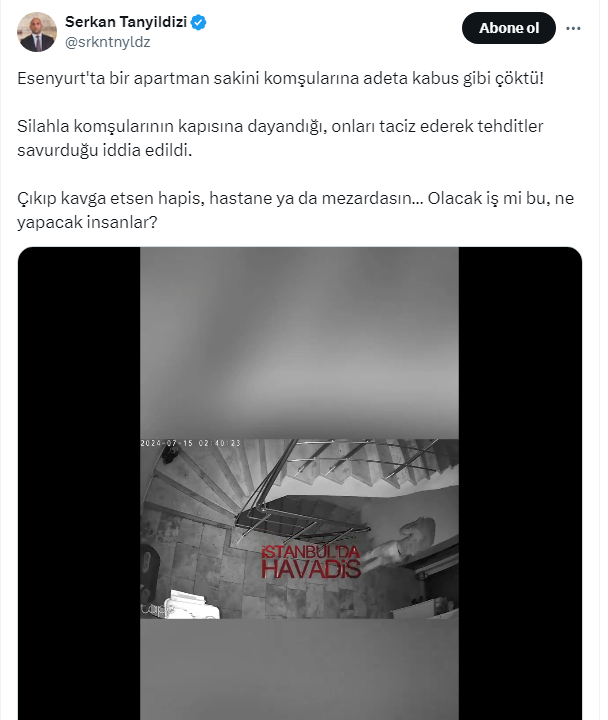 Sosyal Medya Fenomeni Serkan Tanyıldızı binadaki korku dolu anları sosyal medyadan paylaştı. Tanyıldızı sosyal medya hesabından ''Esenyurt'ta bir apartman sakini komşularına adeta kabus gibi çöktü!'' diyerek isyan etti. İşte o paylaşım ve gelen yorumlar...