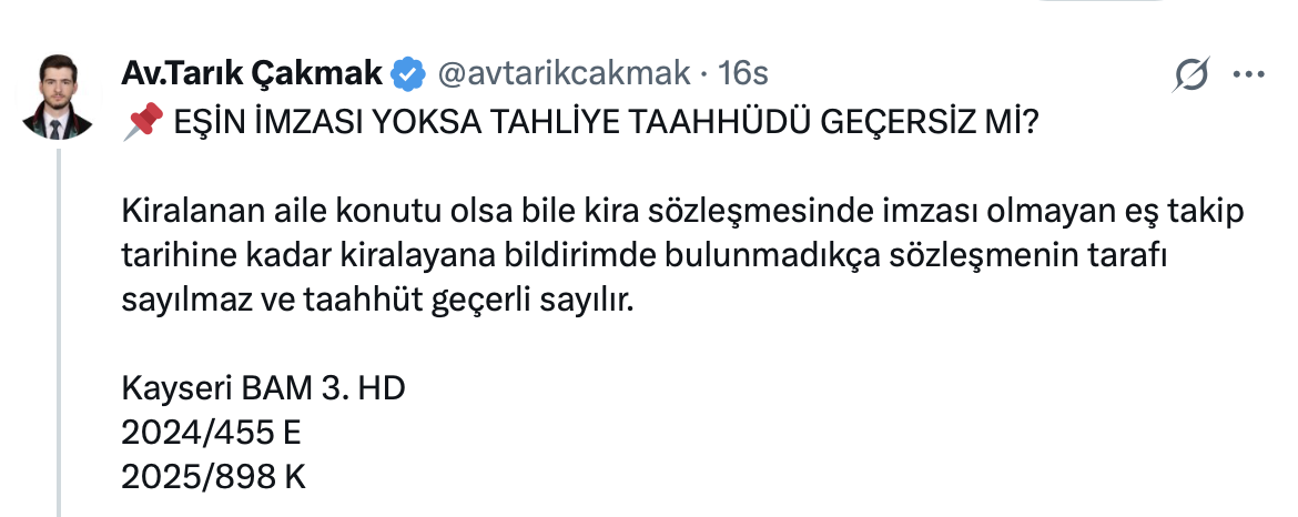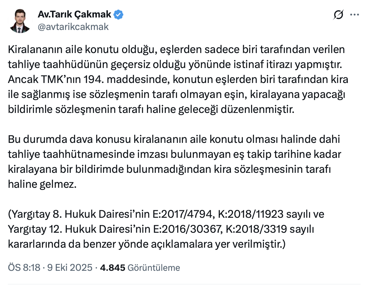 Tarık Çakmak, resmi X hesabı https://x.com/avtarikcakmak üzerinden yaptığı paylaşımda Avukat Tarık Çakmak kiralanan aile konutu olsa bile kira sözleşmesinde imzası olmayan eş takip tarihine kadar kiralayana bildirimde bulunmadıkça sözleşmenin tarafı sayılmayacağını ve taahhütün geçerli sayılacağını belirtti.