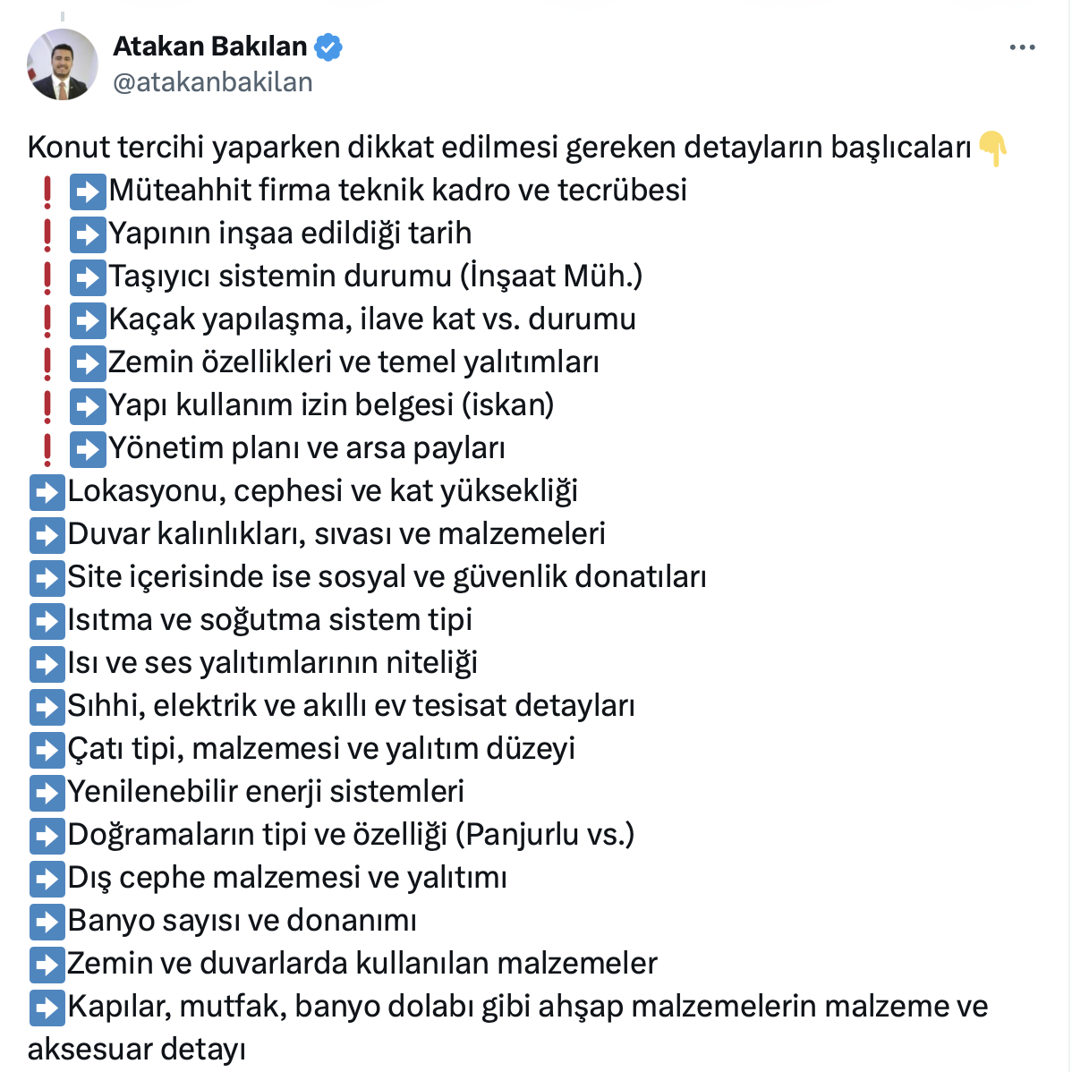 Atakan Bakılan resmi X hesabı https://x.com/atakanbakilan üzerinden yaptığı paylaşımda ev alırken dikkat edilmesi gereken 25 maddeyi açıkladı.