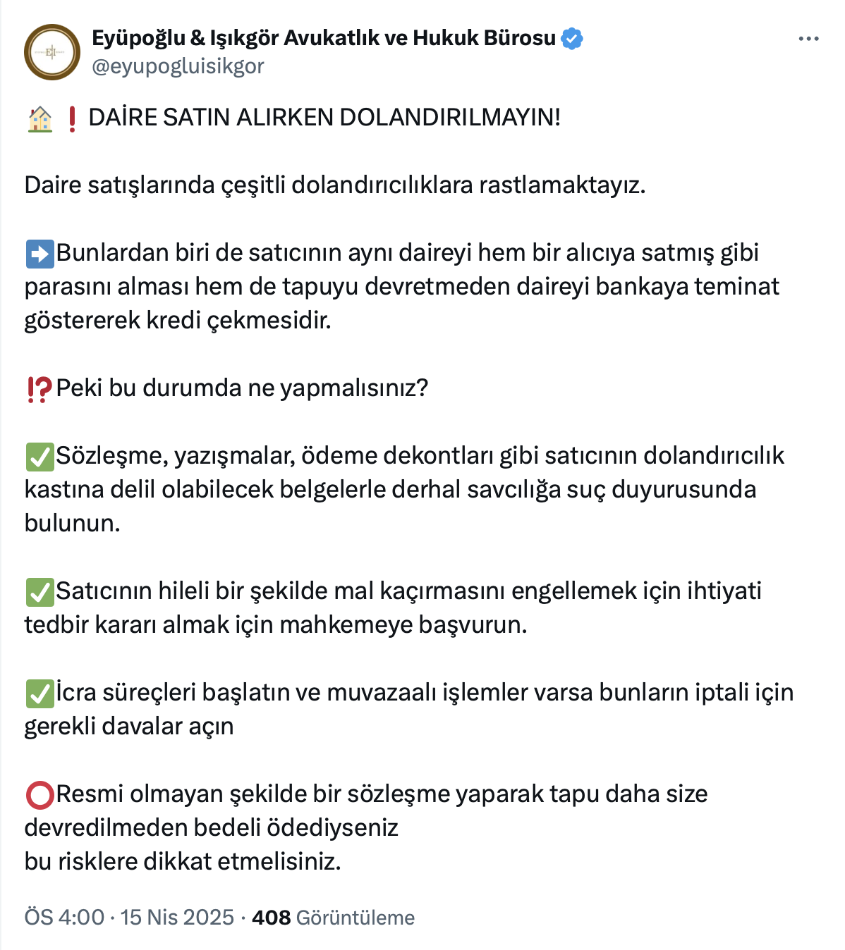 Eyüpoğlu - Işıkgör Avukatlık ve Hukuk Bürosu resmi sosyal medya hesabı https://x.com/eyupogluisikgor üzerinden yaptığı paylaşımda ev alırken, dolandırılmamak için nelere dikkat edilmesi gerektiğini açıkladı.