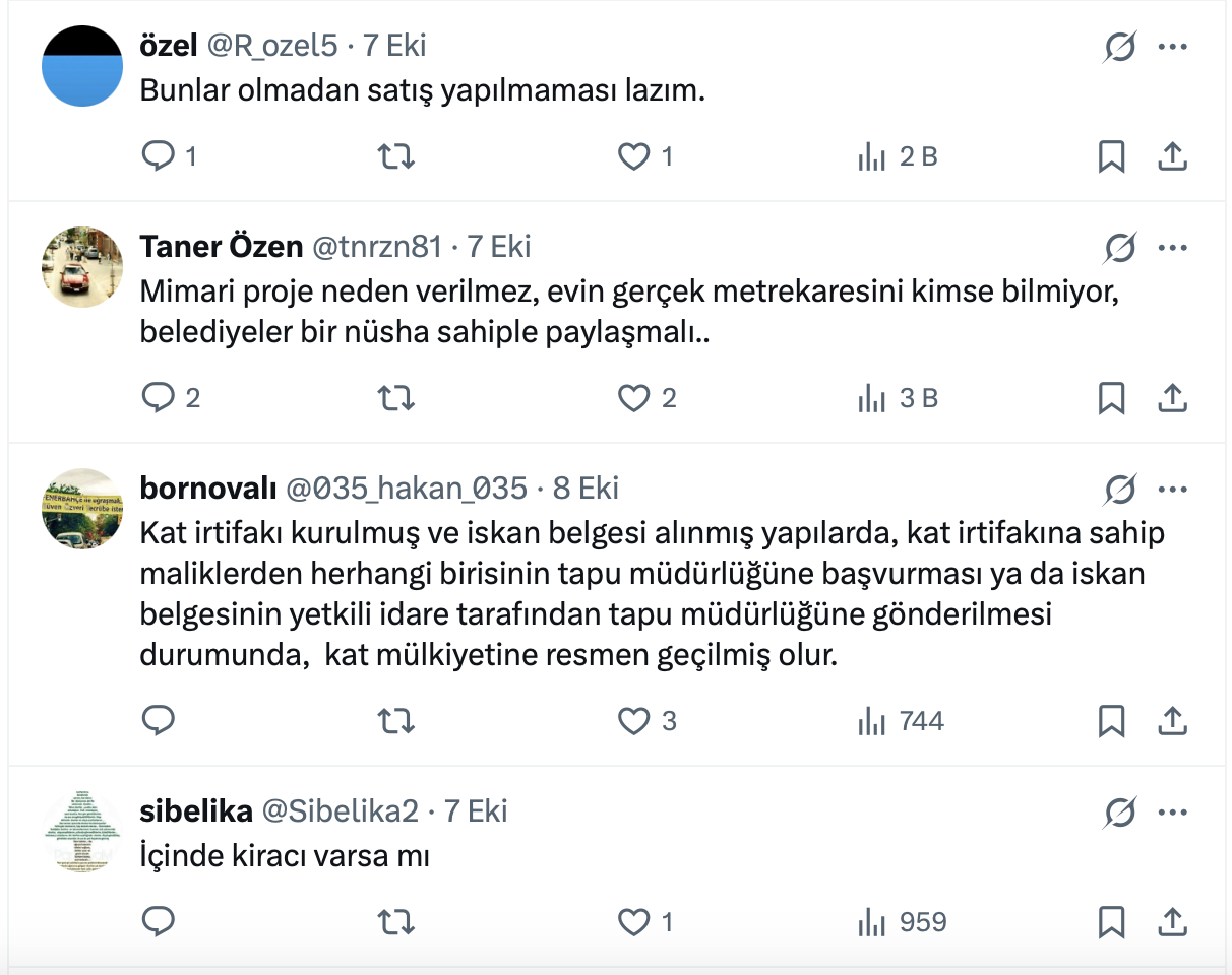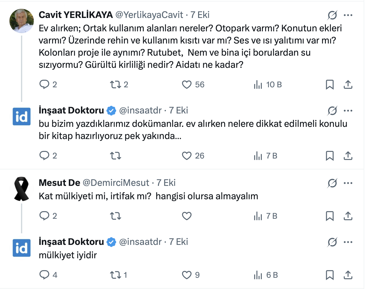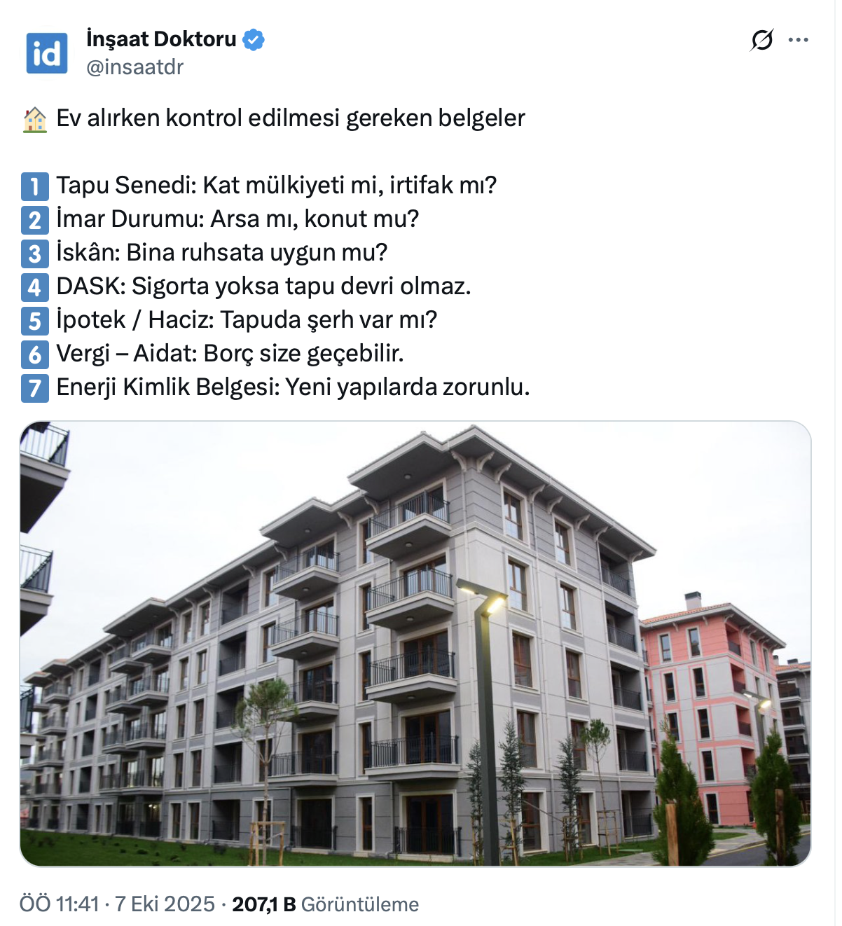 Konut yatırımlarının gündemin en çok konuşulan konuları arasında yer aldığı şu günlerde 61,4 bin takipçili İnşaat Doktoru resmi X hesabı https://twitter.com/insaatdr üzerinden yaptığı paylaşımda ev alırken kontrol edilmesi gereken 7 belgeyi açıkladı.