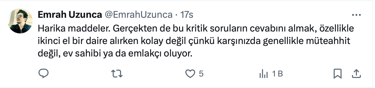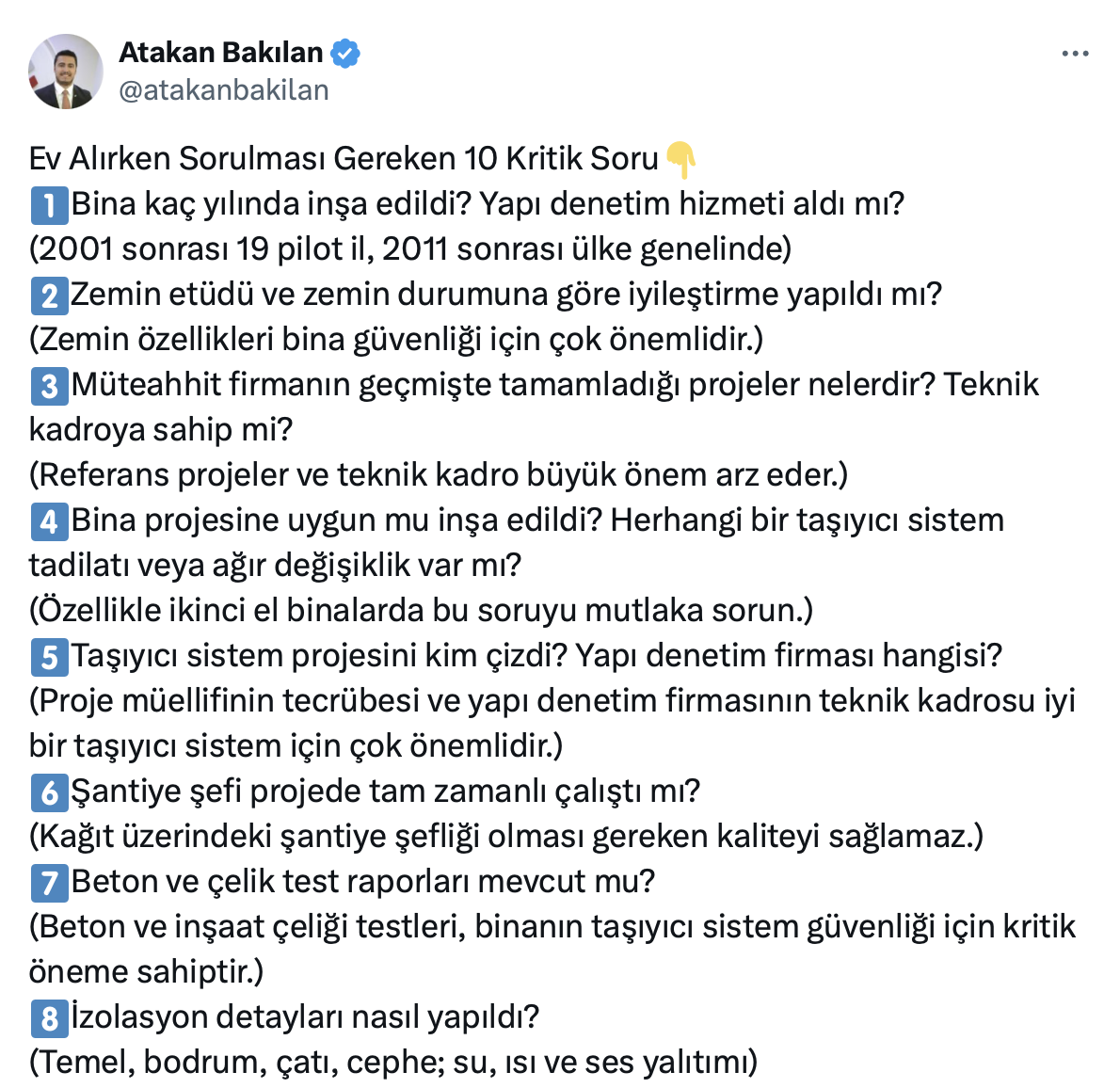 Atakan Bakılan resmi X hesabı https://x.com/atakanbakilan üzerinden yaptığı paylaşımda ev alırken sorulması gereken 10 kritik soruyu açıkladı.