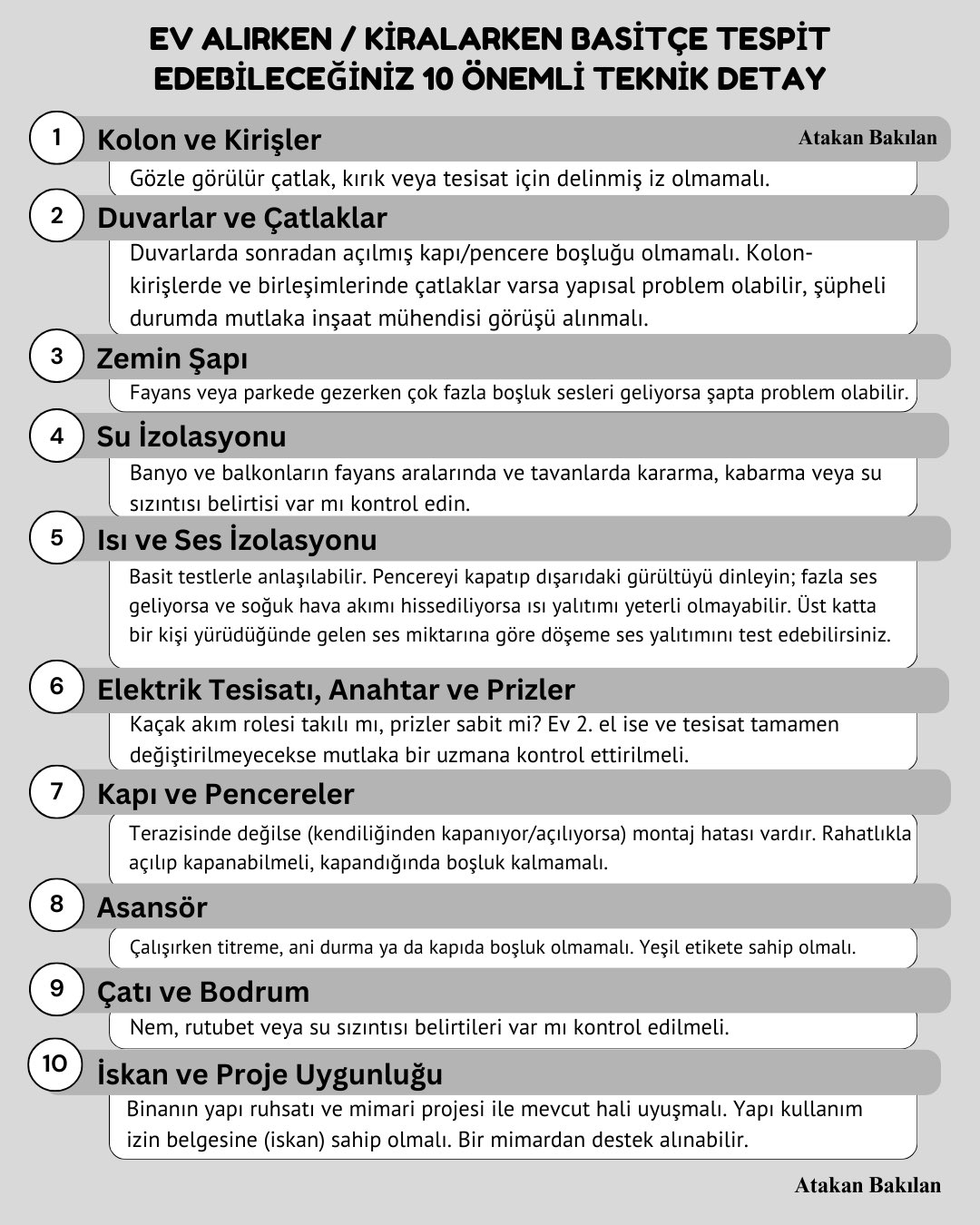 İnşaat Mühendisi Atakan Bakılan, ev almak veye kiralamak isteyen vatandaşların neye dikkat etmeleri gerektiğini 10 maddede uyarıyor. Bakılan, ev alırken veya kiralarken basitçe tespit edebileceğiniz 10 önemli teknik detayı sosyal medyadan açıkladı. İşte ayrıntılar...